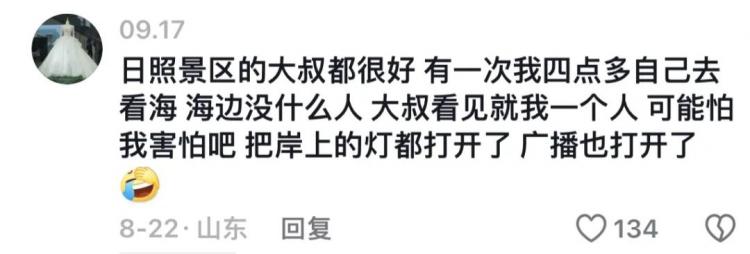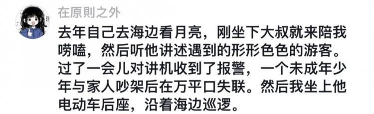 該創(chuàng)作者寫(xiě)到“在過(guò)夜等待日出遇到一位勸導(dǎo)員大叔,他跟我分享工作上的趣事和美滿(mǎn)的家庭與生活,我也分享了一些我的小故事,后來(lái)我們甚至還約著有機(jī)會(huì)了一起去湖北,后來(lái)我再望向海面的時(shí)候,好像也沒(méi)有那么期待日出了,或許那晚的那一刻就是我旅行的意義。”而這僅僅是保安員高安峻工作中的一次普通勸導(dǎo)。北起萬(wàn)平口海上救助中心,南至演藝廣場(chǎng),這段接近四百米的金沙灘,便是他的執(zhí)勤區(qū)域。每次當(dāng)值,高安峻都要在這里巡視十二個(gè)小時(shí)。