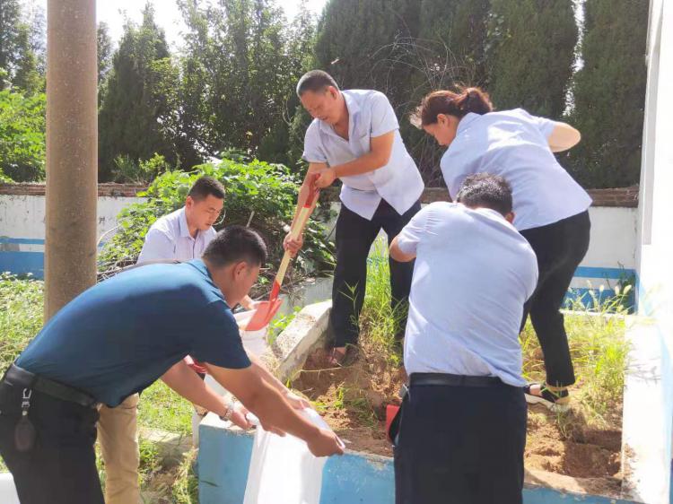 畫面3:8月10日,瑞營物業(yè)公司“三供一業(yè)”接管的老舊小區(qū)現場,瑞營物業(yè)公司王漢偉經理帶領著工作人員忙碌地裝著沙袋,檢查捆綁固定過的廣告牌及施工材料,所有工程已經通知施工方停工,確保人員安全。為了應對“利奇馬”臺風即將帶來的災害,瑞營物業(yè)公司成立了防汛小組,10日至11日24小時全天候在崗,并檢查了服務小區(qū)所有排水管道,抽取了化糞池,確保防汛排水暢通。瑞營物業(yè)人無懼風雨,力求及時、細致做好每一項工作,不留一項隱患。