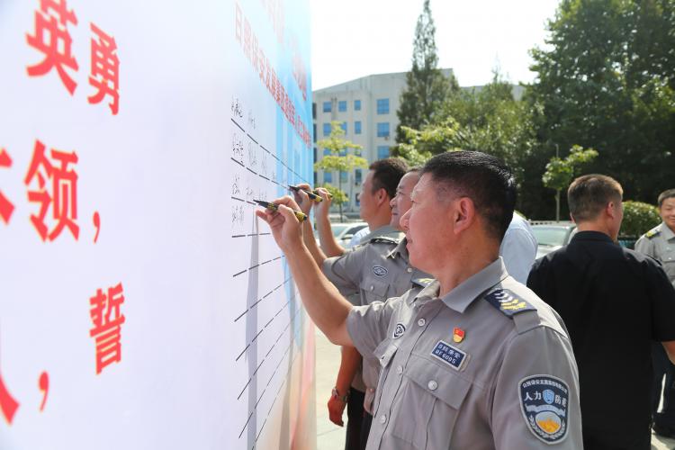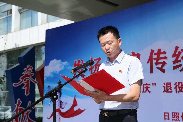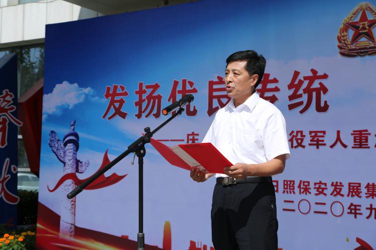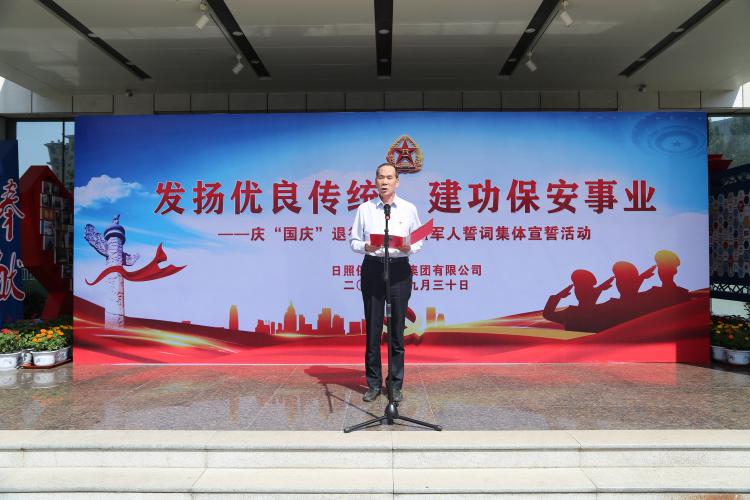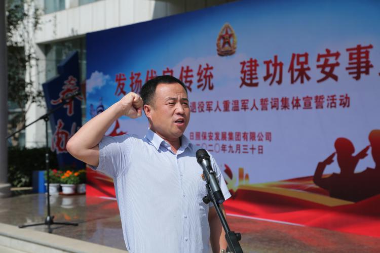 宣誓完成后,尹相光同志代表集團(tuán)黨委發(fā)表講話,他對廣大退役軍人員工在日照保安事業(yè)發(fā)展中做出的積極貢獻(xiàn)給予充分肯定,并對退役軍人員工立足保安崗位建功立業(yè)提出希望和要求:一是堅定政治立場,錘煉政治品格,堅定不移聽黨話、跟黨走,進(jìn)一步增強(qiáng)榮譽(yù)感、責(zé)任感、使命感,做集團(tuán)轉(zhuǎn)型升級和創(chuàng)新發(fā)展排頭兵;二是傳承發(fā)揚(yáng)中國軍人不畏強(qiáng)敵、敢于亮劍、堅決戰(zhàn)斗的優(yōu)良作風(fēng),在集團(tuán)改革發(fā)展不斷深化的進(jìn)程中,保持軍人的優(yōu)秀本色,以自己的模范行動影響引導(dǎo)身邊職工群眾;三是勤奮學(xué)習(xí),增強(qiáng)本領(lǐng),在實(shí)踐中求得真知,掌握本崗位工作所需的過硬本領(lǐng),將軍人的優(yōu)秀品質(zhì)和優(yōu)良作風(fēng)轉(zhuǎn)化為促進(jìn)企業(yè)創(chuàng)新發(fā)展的積極因素,續(xù)寫軍營外建功立業(yè)的新篇章。
