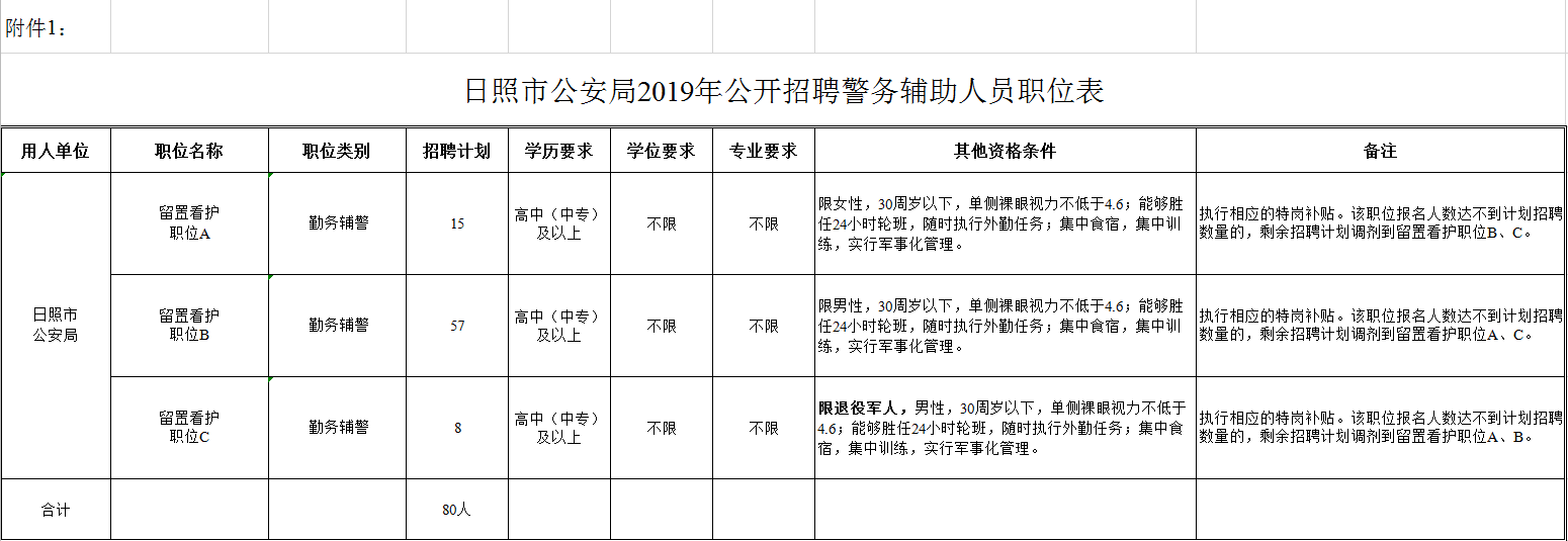招聘勤務(wù)輔警80人。具體招聘職位、招聘計(jì)劃及條件要求見(jiàn)《日照市公安局2019年公開(kāi)招聘警務(wù)輔助人員職位表》(附件1)。